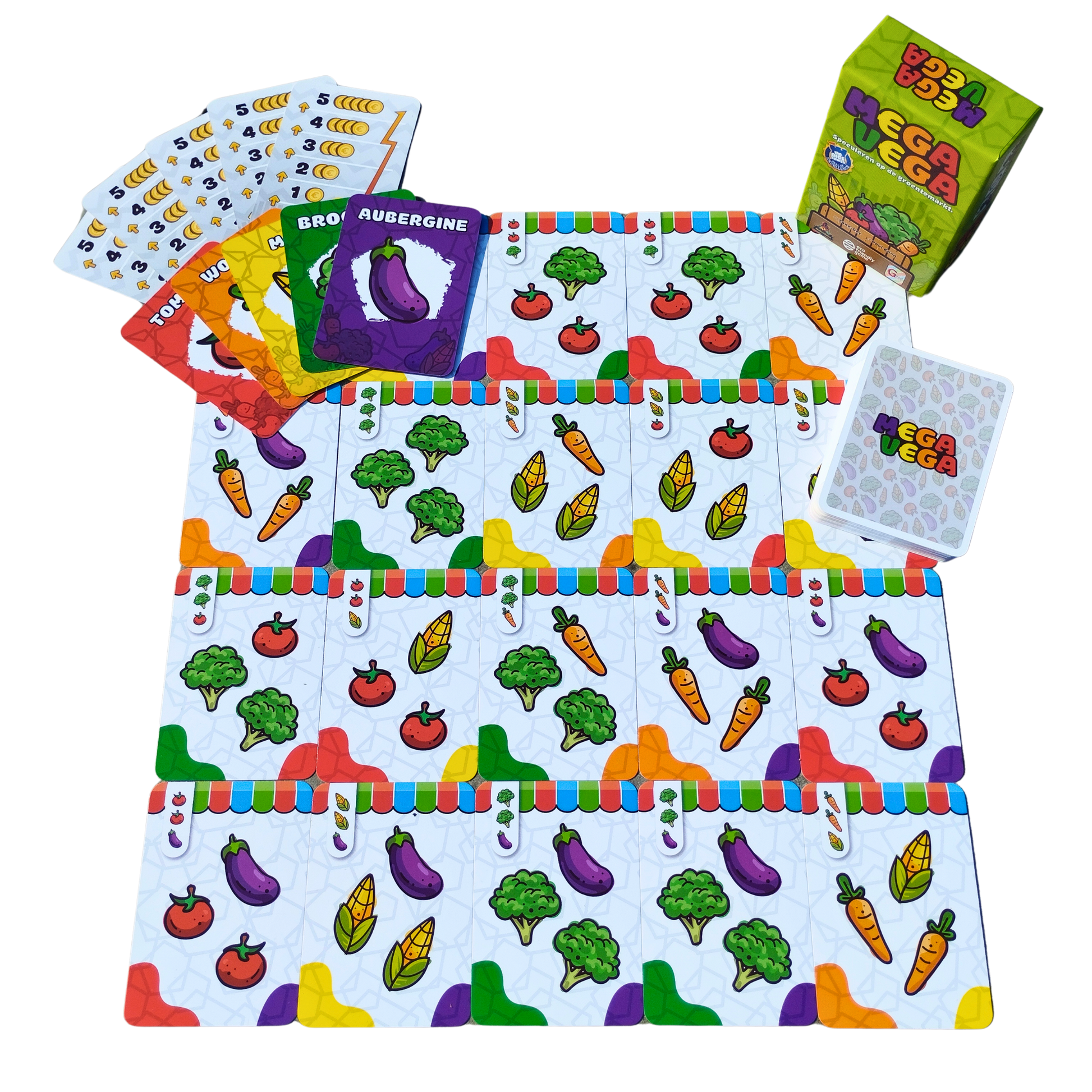 Mega Vega is de Nederlandse versie van Vegetable Stock, het tactische kaartspel dat internationaal lof oogstte en zelfs de felbegeerde Seal of Excellence van The Dice Tower wist te bemachtigen. In dit compacte spel probeer je te investeren in groenten die in waarde stijgen, maar let op: de markt is onvoorspelbaar!